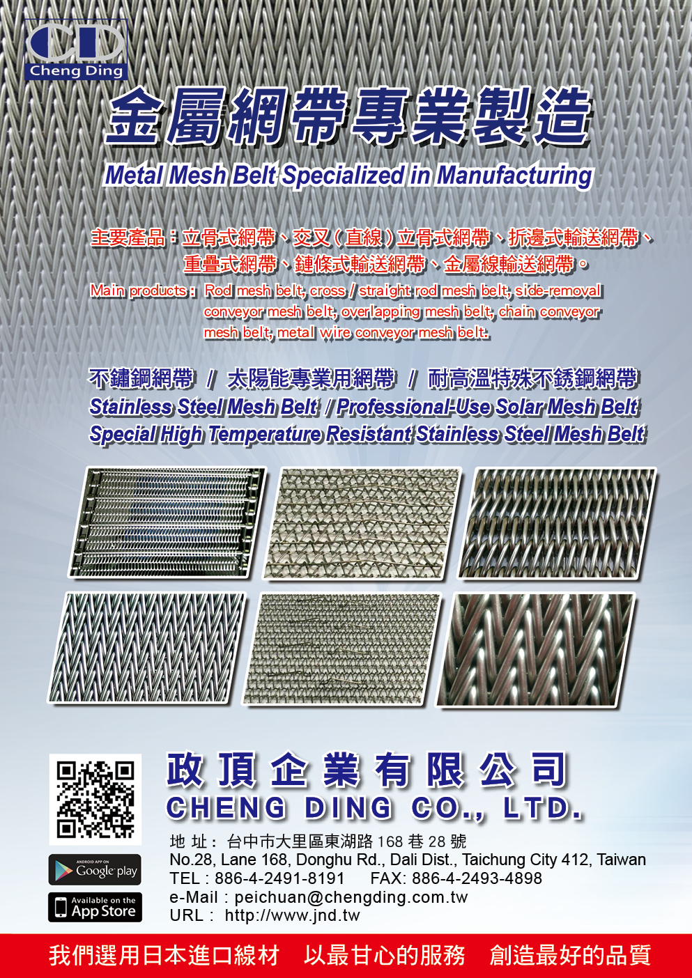 主要產品:立骨式網帶、交叉(直線)立骨式網帶、拆邊式輸送網帶、重疊式網帶、鏈條式輸送網帶、金屬線輸送網帶以及各種用提之金屬網帶之客製化製造。